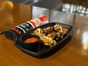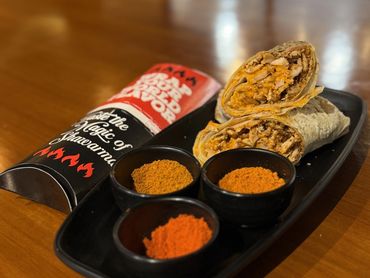 "Enjoy our smoky charcoal grilled shawarma, packed with fresh flavors and wholesome ingredients!"